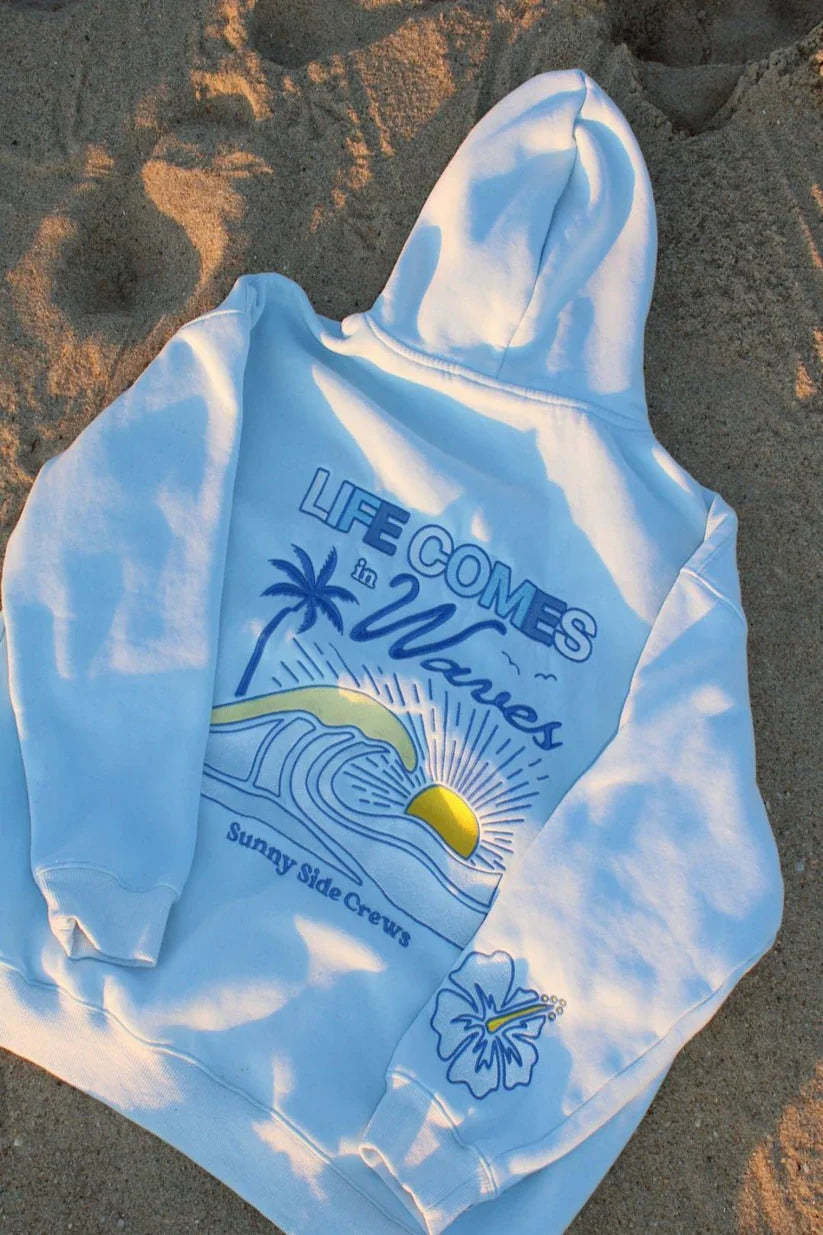 Zachte stof en stijlvolle borduursels. Ideaal voor strand of chillen. Life Comes in Waves hoodie is top! đïž