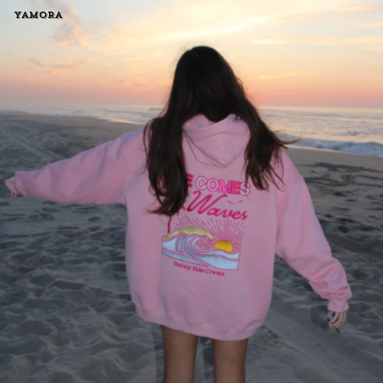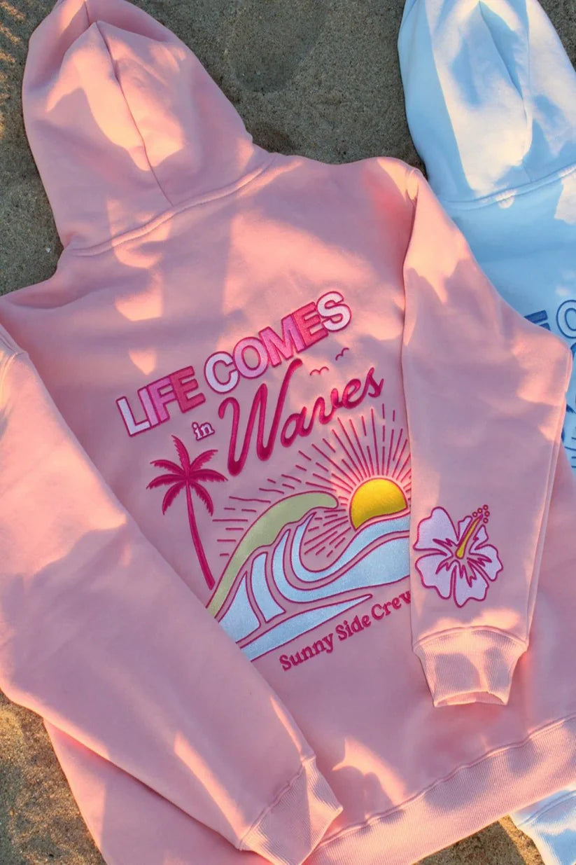Heerlijk luxe en oversized! De Life Comes in Waves hoodie in lichtroze is prachtig. đž